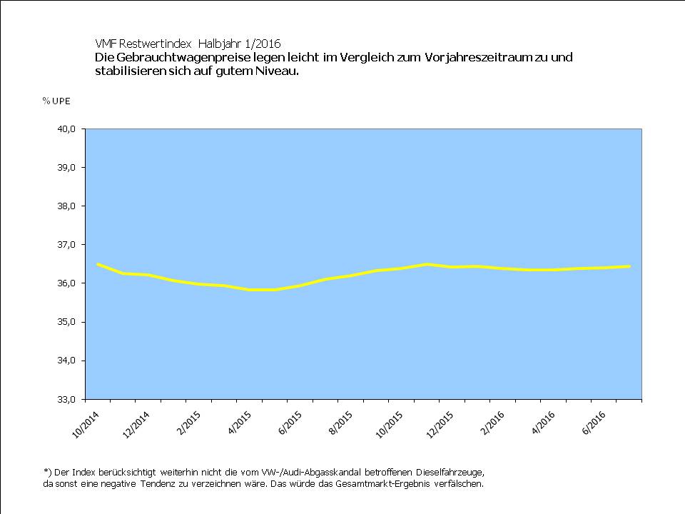 VMF-Restwertindex 1. Halbjahr 2016: Der Wert für Gebrauchte und typische Leasingrückläufer erstmals im Schnitt wieder mehr als 10.000 Euro / Preise auf gutem Niveau / Abgasskandal nicht berücksichtigt
