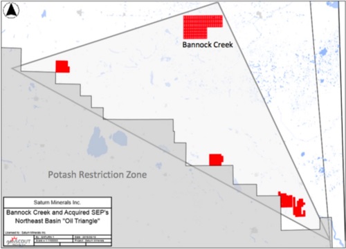 Nach den bisherigen Aktivitäten auf dem ''Bannock Creek''-Gebiet, das nördlich von der ''Potash Restriction''-Zone liegt, hat sich Saturn Minerals dazu entschlossen, die vier Explorationsgebiete direkt an der nördlichen Grenze zur ''Potash Restriction''-Zone zu erwerben. Die Gebiete des Unternehmens ergeben nun ein Dreieck - wobei die neuen Gebiete quasi auf einer Linie liegen und das ''Bannock Creek''-Gebiet sich davon rund 100 Kilometer nördlich befindet.