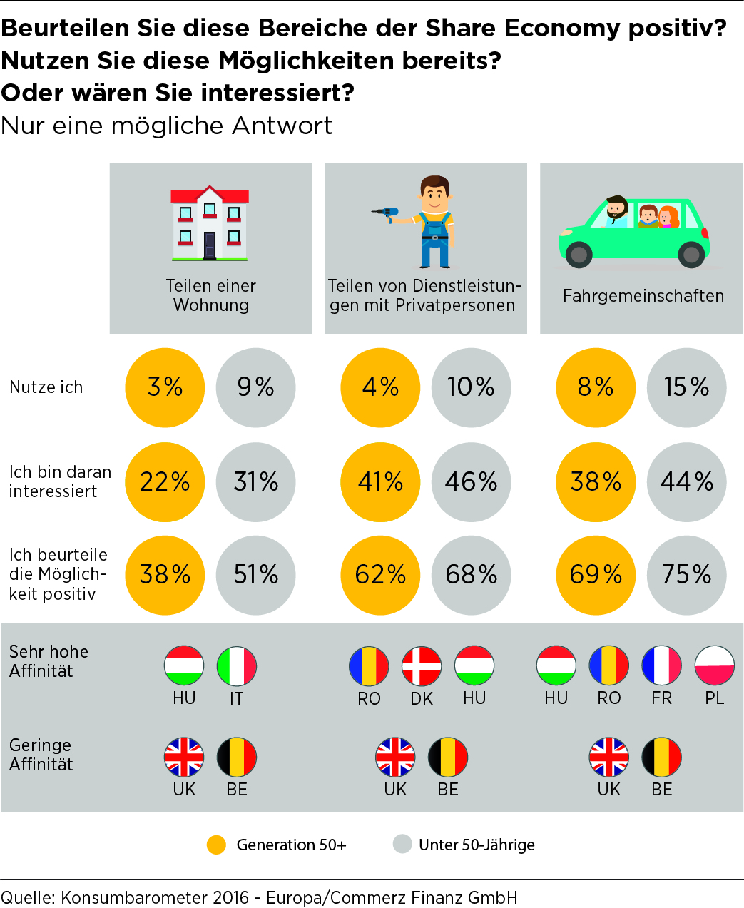 Das Konzept, ein Auto gemeinsam zu nutzen, ist nicht neu. Fahrgemeinschaften gab es schon früher: Sei es, um mit dem Kollegen gemeinsam zur Arbeit zu fahren oder die Nachbarschaftskinder zum Fußball zu bringen. Heutzutage finden sich Fahrgemeinschaften online über Mitfahrerplattformen. Gleichzeitig können die Autoinsassen so neue Bekanntschaften schließen und ins Gespräch kommen - eine Chance, die die Best Ager sehr schätzen. 69 Prozent bewerten diese Möglichkeit positiv, und 38 Prozent können sich vorstellen, selbst per Mitfahrgelegenheit zum Reiseziel zu kommen. Immer mehr Zuspruch finden auch CarSharing-Angebote, wie sie in Großstädten schon länger verfügbar sind. Besonders junge Europäer besitzen kein eigenes Auto mehr, sondern nutzen nach Bedarf ein Auto der CarSharing-Flotte (24 %). Auch 15 Prozent der Generation 50+ würden ihr Auto künftig mit anderen teilen. Bei Motorrollern und Fahrrädern liegt die Bereitschaft sogar bei 19 Prozent.
