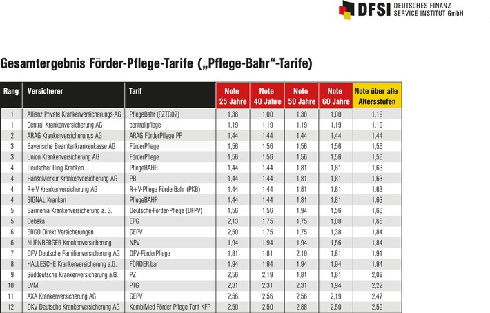 Pflegezusatzpolicen punktgleich auf Platz 1.