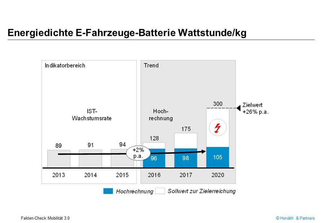 Während auf der einen Seite der Preis für Elektrobatterien in den letzten Jahren deutlich gesunken ist, hat sich bei aller technischen Entwicklung das benötigte Gewicht kaum verändert. Die Schlüsselkennzahl, Wattstunde pro Kilogramm (Wh/kg), lag bei den Modellen aus dem Jahr 2012 bei 86. Bis 2015 hat sich der durchschnittliche Wert aller in Deutschland neu zugelassenen Modelle auf 94 Wh/kg verbessert, ein Plus von gerade einmal 10 Prozent.