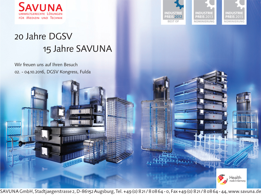 (IINews) - Augsburg, 15. September 2016 - Zwanzigjähriges Jubiläum feiert heuer der Fachkongress zur Aufbereitung von Medizinprodukten der Deutschen Gesellschaft für Sterilgutversorgung e.V. (DGSV). Im Rahmen der Veranstaltung präsentiert die SAVUNA GmbH (http://www.savuna.de)ihre mehrfach mit Industriepreisen ausgezeichneten Produkte für die Reinigung/Desinfektion, Sterilisation und Lagerung thermostabiler und thermolabiler Instrumente. Der DGSV-Fachkongress findet von 02. bis 04. Oktober 2016 in Fulda statt (Kongress- und Kulturzentrum Hotel Esperanto).