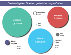 - Herkunft der geleakten Daten: Zu den größten Quellen der geleakten Login-Daten zählen soziale Netzwerke. 30 Prozent aller kompromittierten Zugangsdaten gehen auf Hacks auf LinkedIn zurück, 21 Prozent auf MySpace und 8 Prozent auf Tumblr. Eine große Anzahl der öffentlich gewordenen Daten stammt aus Leaks bei Adobe (25 Prozent) und iMesh (5 Prozent) sowie verschiedener Gaming-Seiten, u. a. MPGH (6.641). Eher unerwartet Quellen waren Dating-Websites wie Ahsley Madison, Adult Friend Finder und Mate1: Bei den hier geleakten Zugangsdaten handelt es sich nämlich in der Regel um unternehmenseigene Mitarbeiteraccounts.