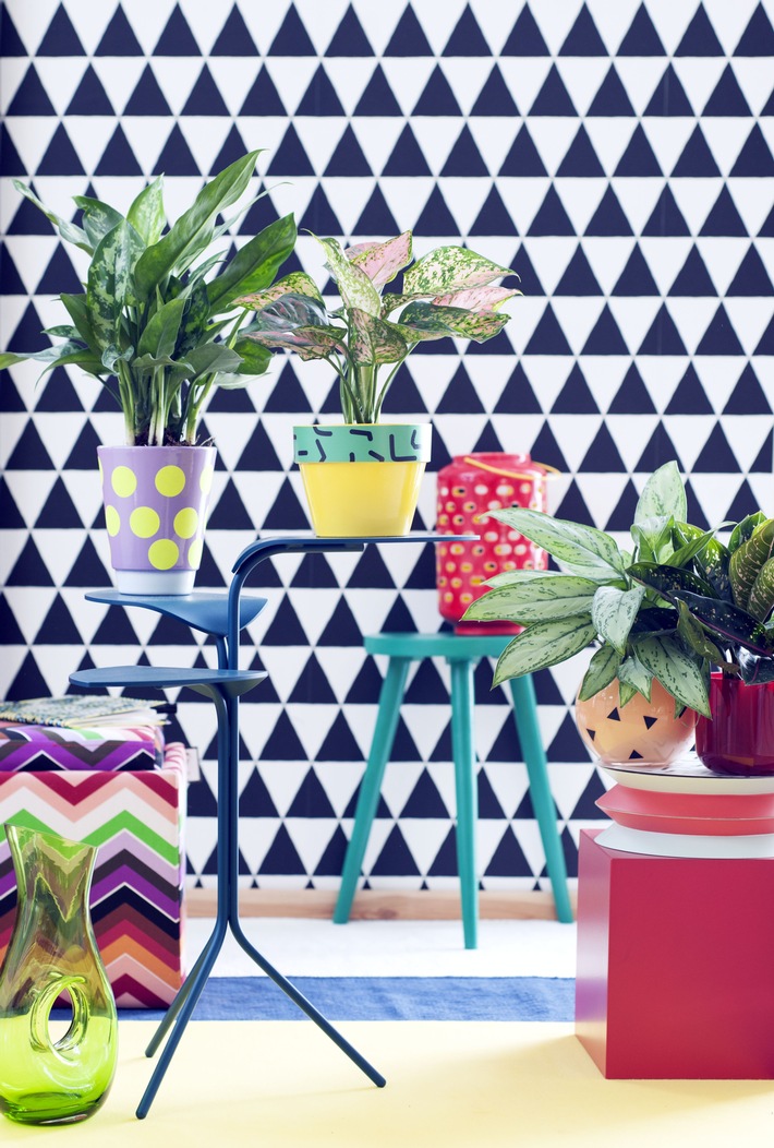 grafischen Formen beklebte Töpfe und bunte Accessoires im 70er Jahre