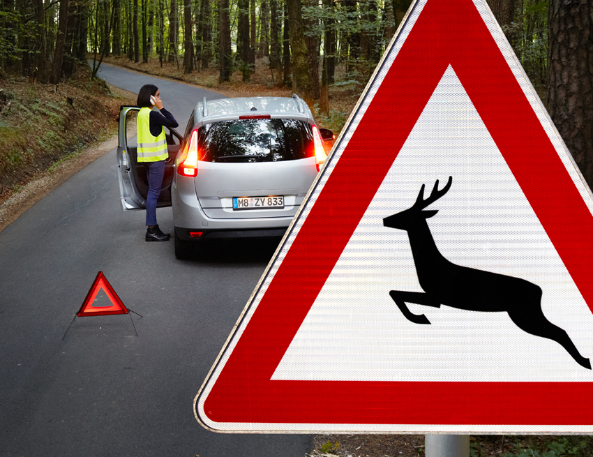 Ist der Unfall passiert: Sofort die Warnblinkanlage anschalten, Warnweste anziehen, die Unfallstelle mit einem Warndreieck sichern und die Polizei verständigen. - In den meisten Bundesländern ist der Anruf ohnehin obligatorisch. - Die Beamten informieren den Jagdpächter, nehmen den Unfall auf und erstellen eine Bescheinigung über den Wildunfall. Letztere braucht man für seinen Versicherer, sobald der Schaden die 1.000 Euro-Grenze übersteigt.