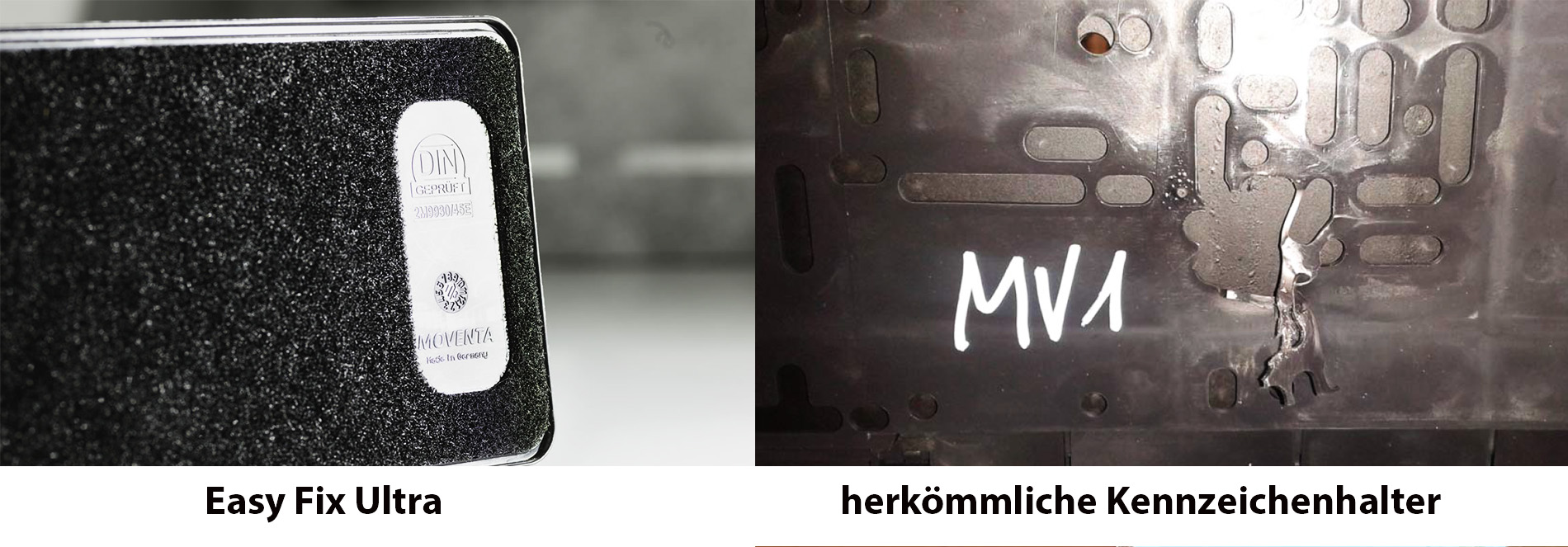 Die getesteten herkömmlichen Kennzeichenhalter der Firmen Würth, Utsch und Seitz konnten beim Test im Vergleich zum EASY FIX Ultra Klettsystem nicht überzeugen. Es kam unter anderem zum Ausriss an der Schraub-Befestigung des Rahmens (fahrzeugseitig), die Verschlussleiste hat sich teilweise gelöst und auch Verformungen des Kennzeichens traten auf. Zudem wurde die Demontagezeit der Kennzeichenhalterungen geprüft. Auch hier war das EASY FIX Ultra Klettsystem den herkömmlichen Kennzeichenhalterungen klar überlegen. Die Diebstahlsicherheit ist somit bis zu zehnmal höher als bei gewöhnlichen Kennzeichenhalterungen, wie die Testergebnisse des TÜV Süd beweisen.