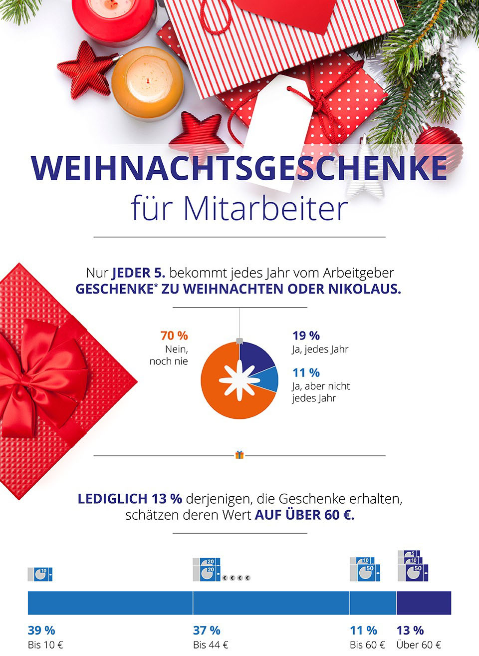 Allerdings erhalten nur 20 Prozent der befragten Arbeitnehmer in Deutschland in ihrem Unternehmen Sachgeschenke zu Nikolaus und Weihnachten. Und bei mehr als Dreiviertel der Beschenkten haben sie einen Wert, der unter 44 Euro liegt und damit steuerfrei ist. Fünf Prozent der jungen Generation würden auf diese kleinen Geschenke verzichten und wünschen sich stattdessen, dass ihr Unternehmen einen Gutschein oder eine Spende für einen guten Zweck vergibt.