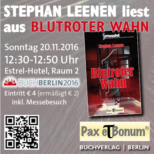 Pax et Bonum http://www.pax-et-bonum.net/ präsentiert die »Spreenebel«-Reihe auf der Buch Berlin im Neuköllner Hotel Estrel: Am Sonntag, den 20.11. um 12:30 Uhr liest der Autor Stephan Leenen im Raum 2 aus seinem Krimi »Blutroter Wahn«. Der Eintritt von 4 (ermäßigt 2) berechtigt natürlich zum Besuch des gesamten Messebereichs. Der Verlag selbst stellt sein Programm am Stand 5 aus.