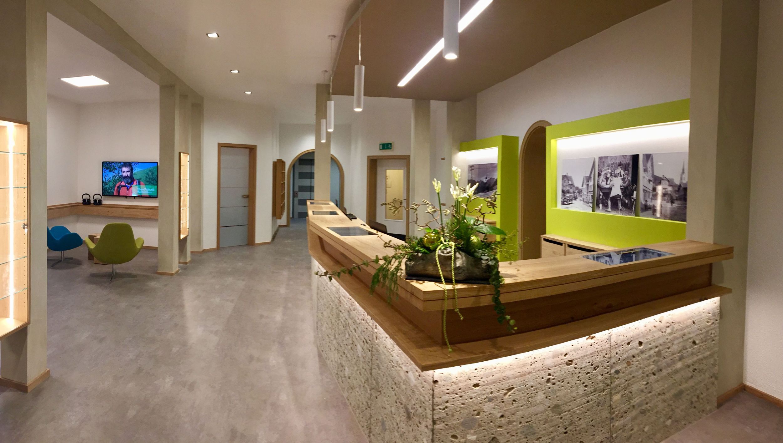 Auf einem Großbildschirm in einer gemütlichen Loungezone lassen sich über Kopfhörer via Oberstaufen-TV neue Oberstaufenfilme anschauen - morgens, mittags und abends mit wechselnden Reportagen, lokalen Nachrichten, Event- und Entdeckertipps.