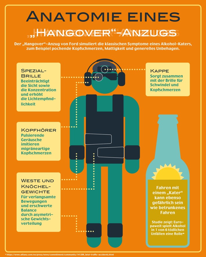 Neuer "Hangover"-Anzug von Ford macht deutlich: Autofahren mit Restalkohol ist lebensgefährlich