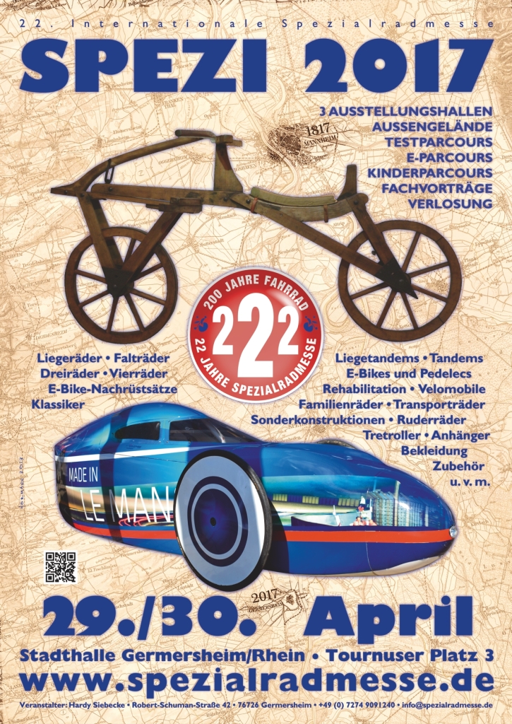 Im Jahr 1817 fuhr Karl Drais erstmals auf einer Laufmaschine, der sogenannten Draisine, durch Mannheim. Die Laufmaschine gilt als die Urform des Fahrrads. Heute ist das Fahrrad weltweit das am meisten genutzte Verkehrsmittel und zentrales Element in der nachhaltigen und zukunftsfähigen Mobilität. "Ein Fahrrad mit besonders hoher Zukunftsorientierung ist zweifelsfrei das Velomobil. Die Velomobilhersteller besetzen jedes Jahr auf der Messe optisch wie inhaltlich einen Schwerpunkt", so Spezi-Veranstalter Hardy Siebecke. "Bereits jetzt sind über ein Dutzend Velomobilhersteller angemeldet. Diesem Stellenwert zollt 2017 auch unsere Podiumsdiskussion - Velomobil quo vadis? - Anerkennung. Denn schließlich empfehlen sich Velomobile mit E-Motor als echte Alternative zum Auto."