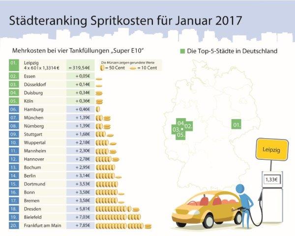 Am günstigsten tankten Kraftfahrer laut des monatlichen clever-tanken-Rankings der 20 größten deutschen Städte Super E10 im Schnitt in Leipzig (1,3314 Euro pro Liter), Essen (1,3316 Euro) und Düsseldorf (1,3320 Euro). Die drei teuersten Super E10-Tankstädte des neuen Jahres waren Frankfurt am Main (1,3641 Euro), Bielefeld (1,3607 Euro) und Dresden (1,3556 Euro). Für vier Tankfüllungen à 60 Liter Super E10 zahlten Autofahrer in Frankfurt 327,38 Euro und somit 7,85 Euro mehr als im günstigen Leipzig.