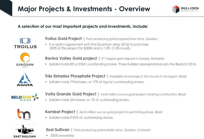 Somit werden Sullidens übrige Projekte und Beteiligungen gerade einmal mit rund 350.000 CAD bewertet, wobei ist der Cashbestand des Unternehmens noch nicht einmal berücksichtigt ist! Und Projekte, beziehungsweise Beteiligungen kann Sulliden noch einige aufweisen. So zum Beispiel das ''Troilus''-Kupfer Projekt, auf dem bis zum Jahr 2010 2 Mio. Unzen Gold und 70.000 Tonnen Kupfer gefördert wurden, das ''East Sullivan''-Projekt, auf dem sich bereits eine früher produzierende Basismetallmine befindet, das größte europäische Goldprojekt ''Rovina Valley''-Gold-, Kupfer- Silberprojekt und das ''Kombat''-Kupferprojekt gehört noch mit zu den Projekten oder Beteiligungen des Unternehmens.