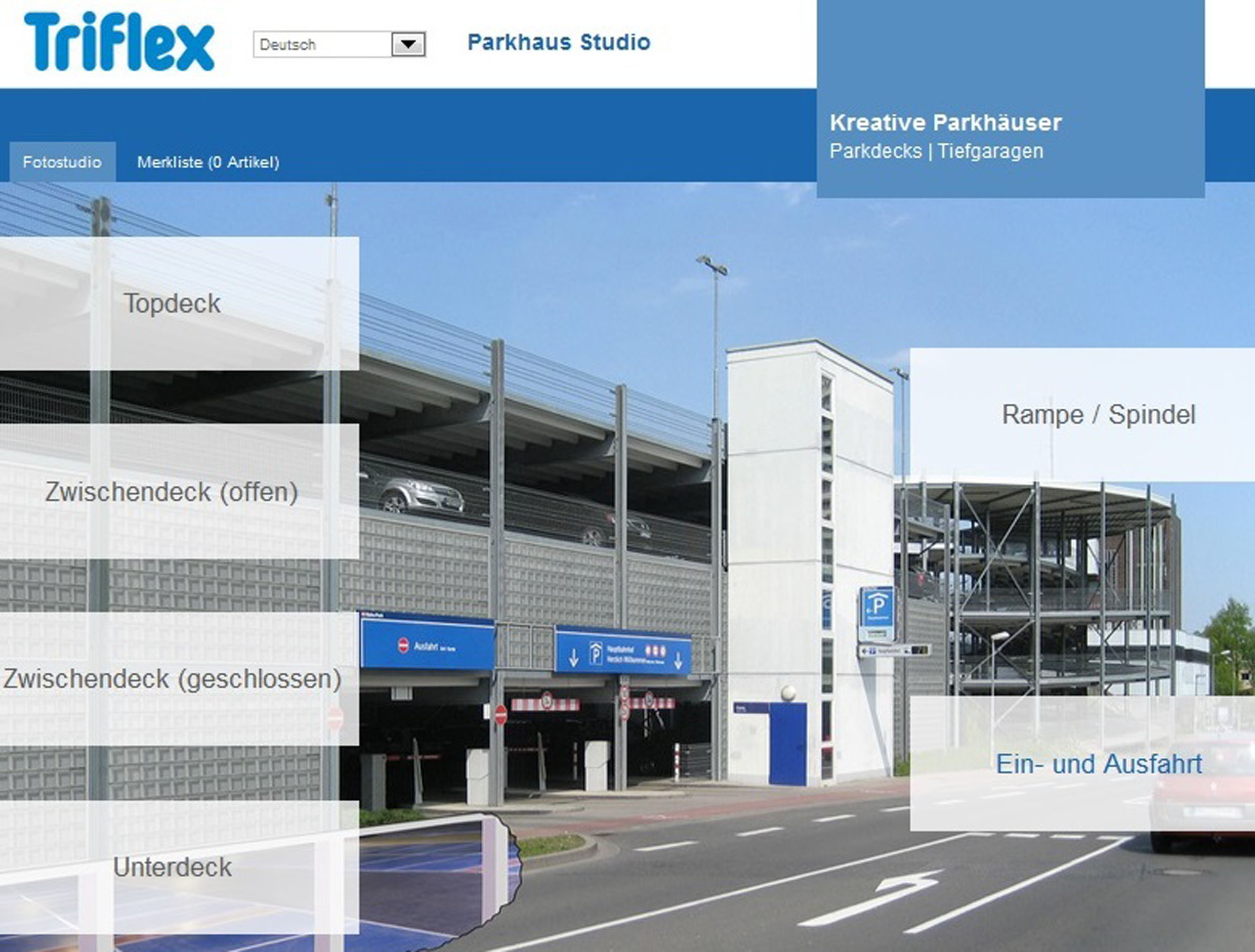 Die Navigation im Triflex Parkhaus-Studio ist spielerisch leicht. Gestaltete Fotos lassen sich speichern oder ausdrucken und finden so direkt Einzug in die Planungsunterlagen. Dank Tablet-PC ist das Programm sogar direkt im Parkhaus abrufbar, so dass Situationen vor Ort simuliert und diskutiert werden können. Die Online Gestaltungssoftware ist unter www.triflex.com/parkhaus-studio auch auf Englisch, Französisch, Italienisch und Niederländisch verfügbar. So erhalten Architekten, Planer und Betreiber mit dem Triflex Parkhaus-Studio praktische Entscheidungshilfen bei der Gestaltung von Parkhäusern.