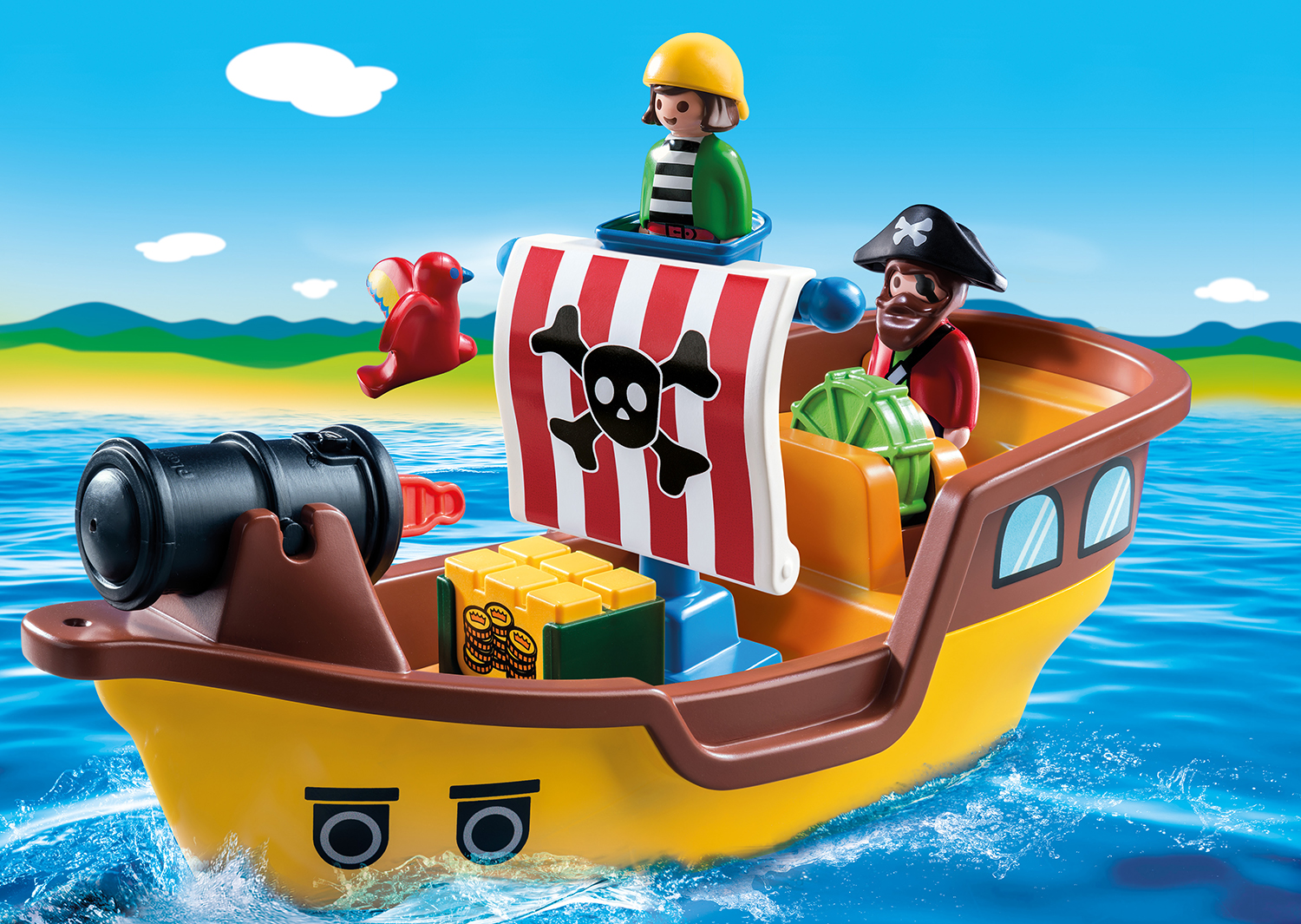 Mit dem Piratenschiff von PLAYMOBIL 1.2.3 gehen kleine Abenteurer auf große Schatzsuche. Egal, ob im Kinderzimmer oder in der Badewanne: mit Kapitän, Matrose und Papagei an Bord können Nachwuchspiraten überall in See stechen. Zur Verteidigung dient die wasserspritzende Kanone an Bord. Und wer besonders aufmerksam Ausschau hält, findet auch die geheime Pirateninsel. Auf ihr wartet nicht nur eine Höhle mit Piratenschatz darauf, entdeckt zu werden ? auch die Formen im Sand laden zum Puzzlen und Lernen ein. Die kleine Schildkröte, die dort ihre Runden schwimmt, freut sich bestimmt über etwas Gesellschaft.