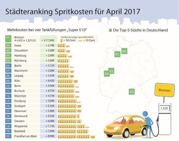 Am günstigsten tankten Kraftfahrer im April laut des monatlichen clever-tanken-Rankings der 20 größten deutschen Städte Super E10 im Schnitt in Bremen mit 1,3212 Euro pro Liter sowie in Essen mit 1,3303 Euro und in Düsseldorf mit 1,3307 Euro. Düsseldorf landete damit zum sechsten Mal in Folge unter den drei günstigsten Tankstädten im Ranking. Hingegen zahlten Kraftfahrer am meisten für den Liter Super E10 in Frankfurt am Main mit 1,3583 Euro, Bielefeld mit 1,3543 Euro und Wuppertal mit 1,3509 Euro. Während Wuppertal zum ersten Mal seit 14 Monaten überhaupt wieder im Ranking auftauchte, wurde Frankfurt am Main zum vierten Mal in Folge Nummer eins der teuersten Tankstädte. Für vier Tankfüllungen à 60 Liter Super E10 zahlten Autofahrer in Frankfurt rund 326 Euro und somit 8,90 Euro mehr als im günstigen Bremen.