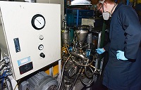Auf dem Foto ist der Sphärisierungsvorgang von AGC zu sehen, der mittels eines japanischen Sphärisierungs-Systems in den USA durchgeführt wird. Die Sphärisierung ist ein kritischer Schritt in der ‚CSPG’-Produktion. Hier werden die flachen Graphitflocken in kugelige Partikel oder Sphäroide umgewandelt.