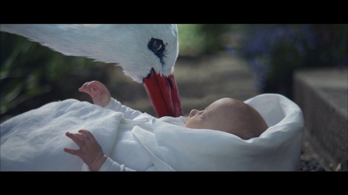 Der Werbespot zeigt einen Storch, der ein Baby trägt und es vor