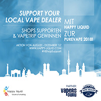 Um auf diesen Missstand hinzuweisen ermutigt happy liquid die Kunden auf, Ihren lokalen Händler zu besuchen und mehr vor Ort zu kaufen und fordert gleichzeitig von den zuständigen Behörden, Möglichkeiten einzuführen, mit denen der Endkunde prüfen kann, ob das Liquid, der Akkuträger oder der Verdampfer der Wahl in Deutschland bereits rechtmäßig verkauft werden darf. Als Dank für die Unterstützung durch die Kunden gibt es auch einen Preis zu gewinnen. Mitmachen kann jeder, der einen happy liquid Partnershop besucht und ein Selfie vor dem Geschäft macht. Dieses kann an die happy liquid Pinnwand oder auf Twitter und Instagram mit dem Hashtag #hlShopSupport gepostet werden. Ausgelost wird am 22.12.2017 – zu gewinnen gibt es eine Reise zur ersten Dampfermesse in München, der PUREVAPE 2018.