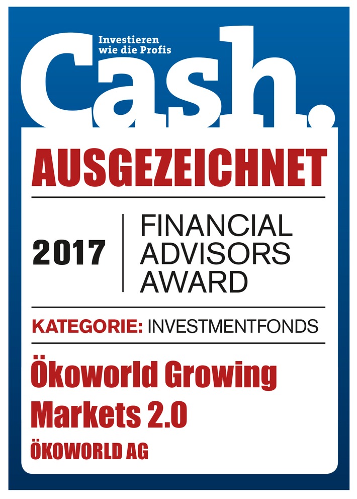 Financial Advisors Award für ÖKOWORLD GROWING MARKETS 2.0 / Schwellenländerfonds erhält auf der Cash. Gala den begehrten Preis in der Kategorie "Investmentfonds (FOTO)