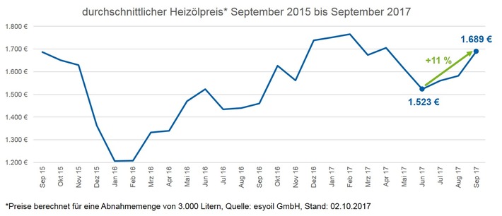 Im September kosteten 3.000 Liter Heizöl im Schnitt 1.689 Euro