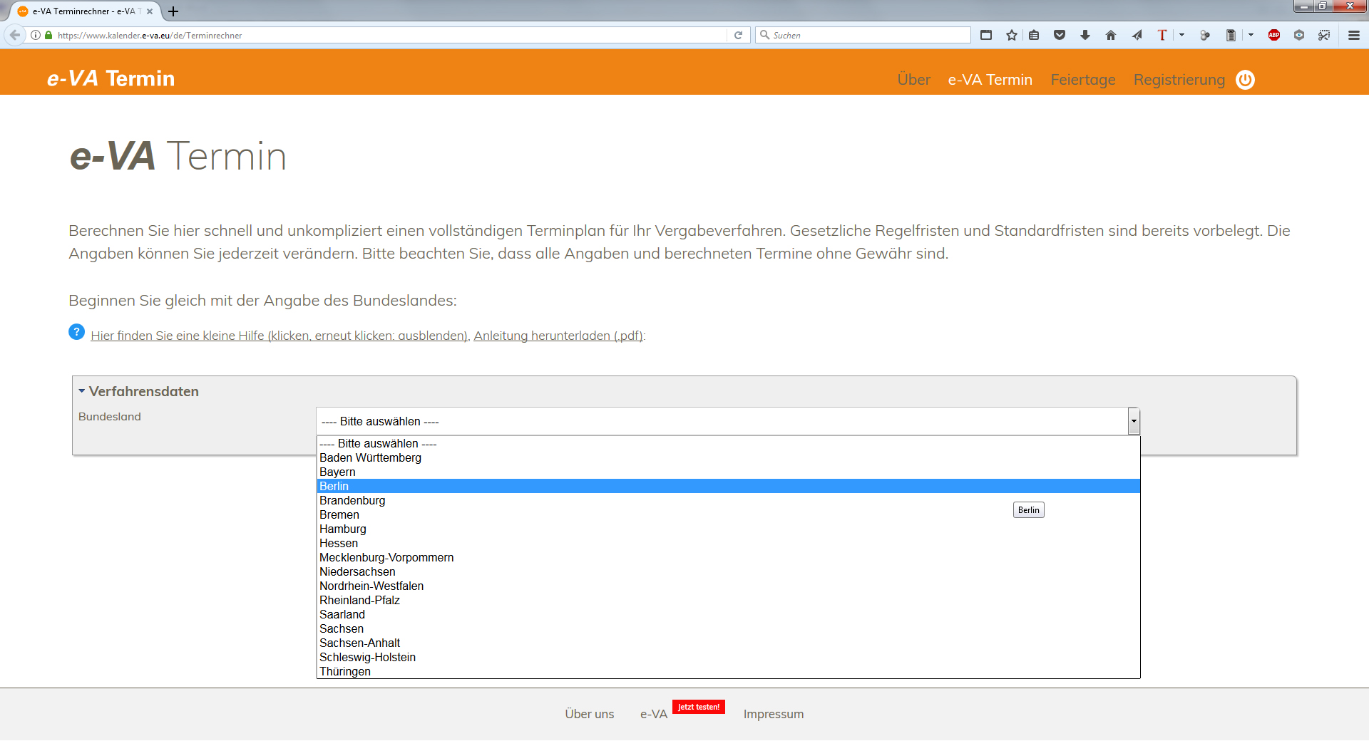 VIZSON stellt damit den Terminrechner "e-VA Termin" aus der von ihr vertriebenen Vergabemanagementsoftware e-VA vor. "e-VA Termin" bietet jeden Termin auch als Startdatum für die Berechnung an und berücksichtigt bundes- und landesweite Feiertage. Alle voreingestellten gesetzlichen Fristen können manuell verändert werden. Dabei können Nutzer auswählen, ob die jeweilige Frist in Kalender- oder in Werktagen angegeben ist und ob das berechnete Datum an einem Wochenende oder einem Feiertag liegen darf. Neu ist die kostenpflichtige Version e-VA Termin Pro. Gegen eine geringe Gebühr können sämtliche Angaben gespeichert und wieder abgerufen, eigene individuelle Fristen eingegeben und die Ergebnisse per E-Mail inklusive Dateianhängen in unterschiedlichen Formaten versendet werden. Außerdem bietet diese Version den Export in das .ics-Format an, das den Import in alle üblichen Kalenderanwendungen erlaubt. Wird der Terminrechner innerhalb der Vergabemanagementlösung e-VA genutzt, können sämtliche berechnete Termine in ein Vergabeverfahren übernommen werden.