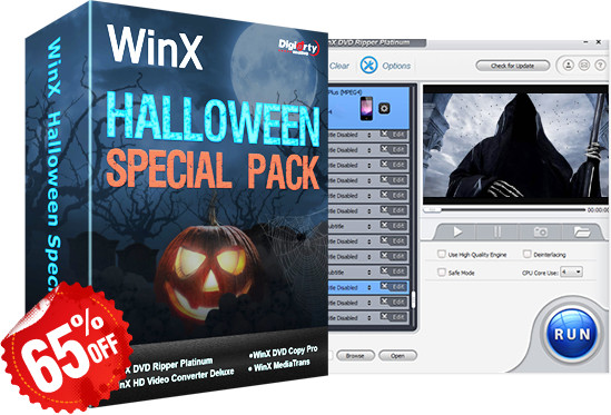 Vorm 31. Oktober können alle Menschen auf der Welt beim Kauf vom Halloween Special Pack (eine Kombination von Top-Produkten WinX DVD Ripper Platinum, HD Video Converter, DVD Copy Pro und iPhone-Dateimanager - WinX MediaTrans) oder eines einzelnen Produktes bis zu 65% sparen. Der Gutscheincode wird unter https://www.winxdvd.com/specialoffer/index-de.htm gefunden.