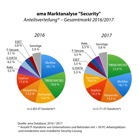 Grundlage für die Analyse bilden 2.403 bzw. 3.171 IT-Standorte (Stand 2016/2017) mit mindestens einer installierten IT-Security-Lösung. Das ama-Research-Team befragte im Sommer 2016 und 2017 die IT-Verantwortlichen in Unternehmen und Behörden nach der Art und den Anbietern der eingesetzten Security-Systeme. Dabei wurde auch erhoben, von welchem Anbieter die jeweiligen Antivirus-/Endpoint-Lösungen stammen. Einbezogen in die Analyse wurden jeweils nur Unternehmen/Behörden mit mehr als 50 PC-Arbeitsplätzen. Wobei die Berechnung der Marktanteile auf der Grundlage der pro Standort von ama identifizierten Security-Anbieter erfolgt. Insofern wurden die wie von den meisten Marktbeobachtern verwendeten Hersteller-Umsätze bzw. Anzahl der eingesetzten Lizenzen bei dieser Anteilsberechnung nicht berücksichtigt.