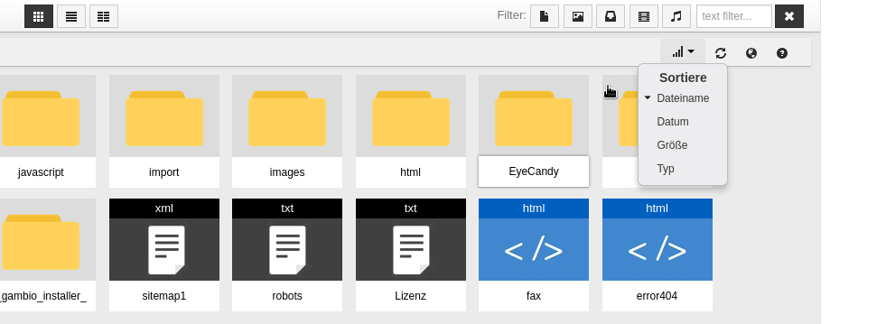 Auch der neu entwickelte Datei-Manager setzt auf kurze Wege: Er ermöglicht die einfache und zentrale Verwaltung von Dateien und Bildern. Das Anlegen von Ordnern ist dabei ebenso einfach möglich wie das Sortieren, Umbenennen oder Löschen von Dateien. Auch der Upload mehrerer Dateien ist somit einfach zu bewerkstelligen. Der Datei-Manager ist in der Gambio-Toolbox eingebettet.
