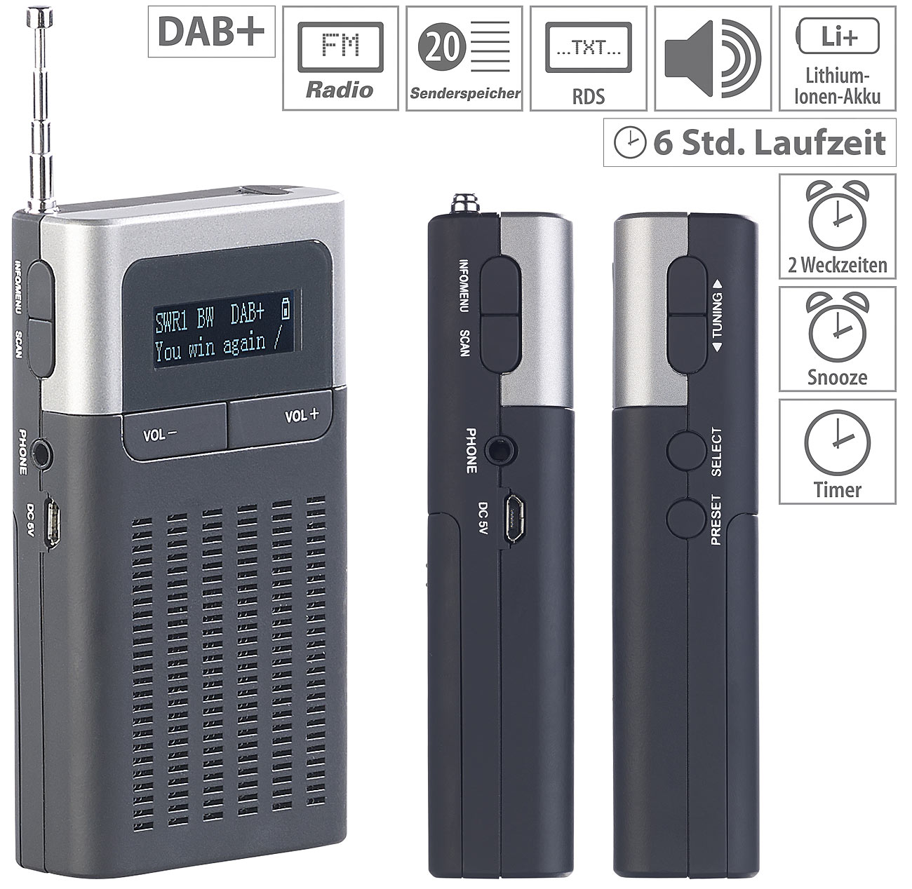 - Taschenradio inklusive Akku, Micro-USB-Ladekabel und deutscher Anleitung