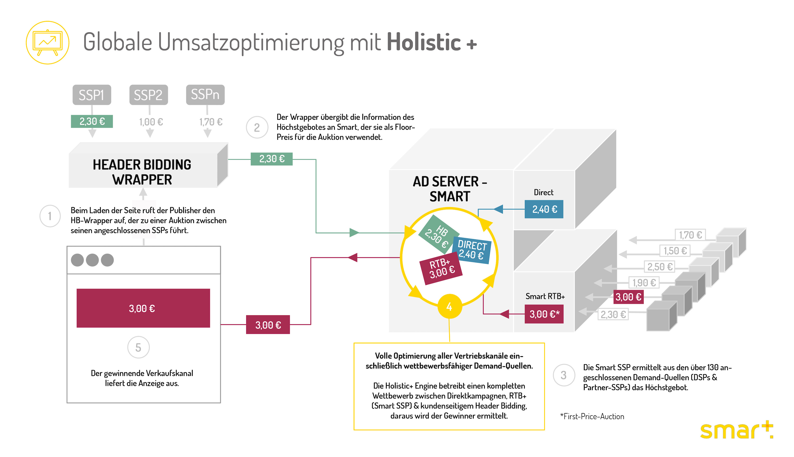 Holistic+ integriert erstmals das Header Bidding in die Auktionsplattform und befähigt Publisher, den Wert jeder einzelnen Impression zu maximieren und ihren Gesamtumsatz nachhaltig zu steigern. Verlage und Vermarkter haben eine größere Kontrolle über ihre Monetarisierungsstrategie und volle Flexibilität bei der Auswahl ihrer Demand-Partner. Mit der Integration von Header Bidding geht Smart einen Schritt weiter als bei dem früheren Holistic-Yield-Angebot, welches die beste Allokation zwischen Direct und Programmatic sicherstellt. Optional können in Holistic+ noch weitere SSPs über Header Bidding an der Auktion teilnehmen, dann besteht die dynamisch allokierte Auktion aus den drei wichtigsten Monetarisierungskanälen: Direktbuchungen (=Adserver), Smart SSP und 3rd Party SSPs. So wird eine hohe Inventarauslastung unter Beachtung der höchstpreisigen Kampagnen gewährleistet.