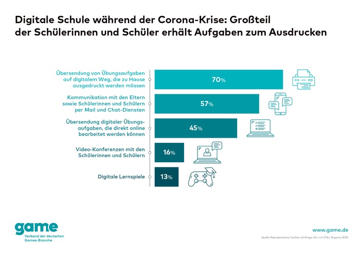 (ots) - Die Corona-Krise und die damit verbundenen Schulschließungen verdeutlichen abermals, wie viel Schulen in Deutschland bei der Digitalisierung noch aufholen müssen. So lautet das Fazit des game - Verband der deutschen Games-Branche zu einer repräsentativen Umfrage unter Eltern, die vom Befragungsinstitut YouGov durchgeführt wurde. Danach erhalten derzeit 70 Prozent der Schülerinnen und Schüler Aufgaben zwar auf digitalem Weg, etwa per Mail, müssen diese aber anschließend zum Bearbeiten ausdrucken. Übungsaufgaben, die auch direkt online bearbeitet werden können, erhalten dagegen nur 45 Prozent. Unterricht per Videokonferenz findet sogar nur in 16 Prozent der Fälle statt. Am seltensten werden digitale Lernspiele eingesetzt, obwohl diese bei den Eltern besonders gut ankommen: So würden 47 Prozent der Eltern, deren Kinder in der Schule bisher keine digitalen Lernspiele nutzen können, sich deren Verwendung wünschen.
