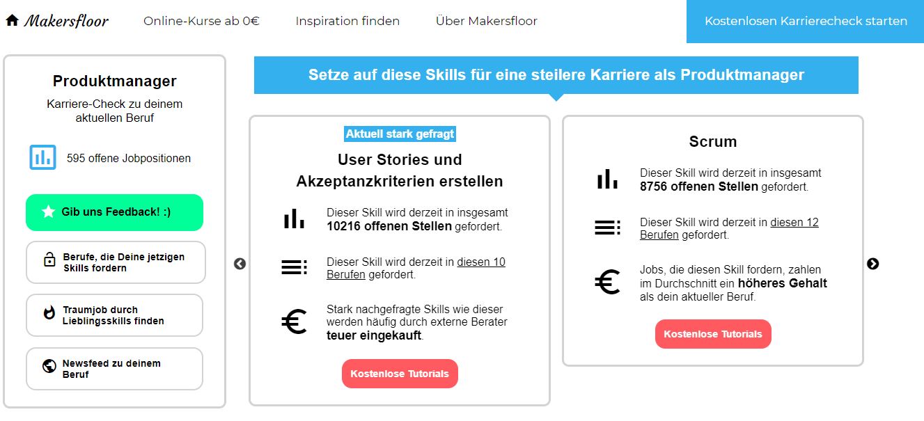 Wer beispielsweise eine Beförderung als Produktmanager anstrebt, kann sich über Makersfloor auslesen lassen, welche Skills für diesen Beruf aktuell am stärksten nachgefragt werden, welche Skills aktuell im Trend sind und wie groß der Bedarf für die unterschiedlichen Skills ist. Somit können Nutzer auch abwägen, ob es sinnvoll ist, in eine Weiterbildung zu investieren.