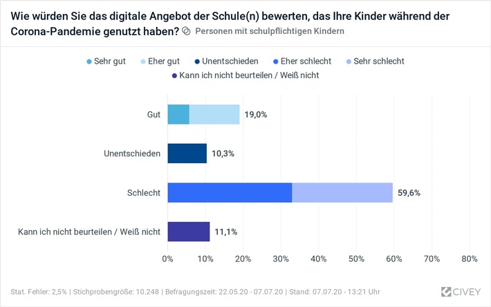(ots) - Die Corona-Pandemie hat die Lücken der digitalen Bildung in Deutschland immens verdeutlicht, wie die neuesten Daten der repräsentativen Kurzstudie von Civey und Digitale Bildung für Alle e.V. zeigen. Nicht mal jede fünfte Person mit schulpflichtigen Kindern (19 Prozent) bewertet das digitale Bildungsangebot, das die Kinder während der Corona-Pandemie genutzt haben, als gut. Rund 60 Prozent sind hingegen unzufrieden. Damit stellen Eltern den Schulen im Land ein schlechtes Zeugnis über das digitale Angebot aus.