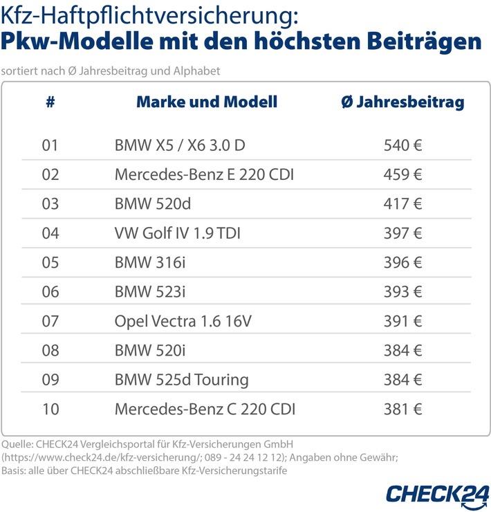 - Kfz-Haftpflichtversicherung teuer für BMW X5/X6 und Mercedes E 220, günstig für SEAT Arona 1.0 - Typklasseneinstufung ein wichtiger Grund für Beitragsunterschiede - 300 CHECK24-Experten beraten bei allen Themen rund um die Kfz-Versicherung