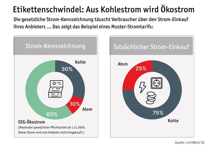 LichtBlick nennt dazu ein Muster-Beispiel: Ein Versorger kauft für das Stromprodukt seiner Kunden 75 Prozent Kohlestrom und 25 Prozent Atomstrom ein. Auf dem Strom-Etikett sinkt der Kohleanteil auf 30 Prozent, der Atomanteil auf 10 Prozent. Stattdessen werden dort 60 Prozent als EEG-Ökostrom ausgewiesen.