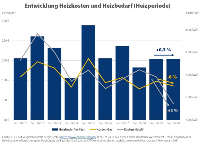 - Heizen mit Gas in der beginnenden Heizperiode acht Prozent günstiger als im Vorjahr - Gas bei Alternativanbietern aktuell 37 Prozent günstiger als in der Grundversorgung - CO2-Mehrkosten ab Januar 2021: jährlich 119 Euro für Gas, 158 Euro für Heizöl
