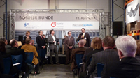 Schauplatz der „Bonner Runde“ war das von der Agentur rheinlandrelations zur beeindruckenden Bühne umgestaltete Hochlager der Gemeinnützigen Werkstätten. Im Rahmen der Podiumsdiskussion diskutierten Oberbürgermeister Jürgen Nimptsch, der BVMW-Kreisvorsitzende Wolfram J. Löser, Jochen Hellmann (NRW.Bank) und Oliver Coppeneur (Confiserie Coppeneur et Compagnon GmbH) vor mehr als 100 Unternehmern aus der Bonner Umgebung über den Standort Bonn und frische Impulse für den Mittelstand.