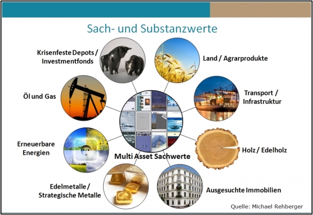 Entscheidend ist Schritt drei, in dem es um die Entwicklung und Umsetzung einer individuellen Strategie geht. Neben der hohen Bedeutung die der Auswahl der Lösungen und Vertragspartner zukommt, ist im Vorfeld die Zusammensetzung der Anlageklassen, auf die momentane Vermögensstruktur abzustimmen. Beispiele für krisenfeste Sachwerte sind: Edelmetalle, ausgewählte Immobilien, alternativer Energien, Öl, Gas, Edelholz, Wasser, ausgesuchte Rohstoffe, Multi Asset Fonds, krisenfeste Fonds und Grundstücke.