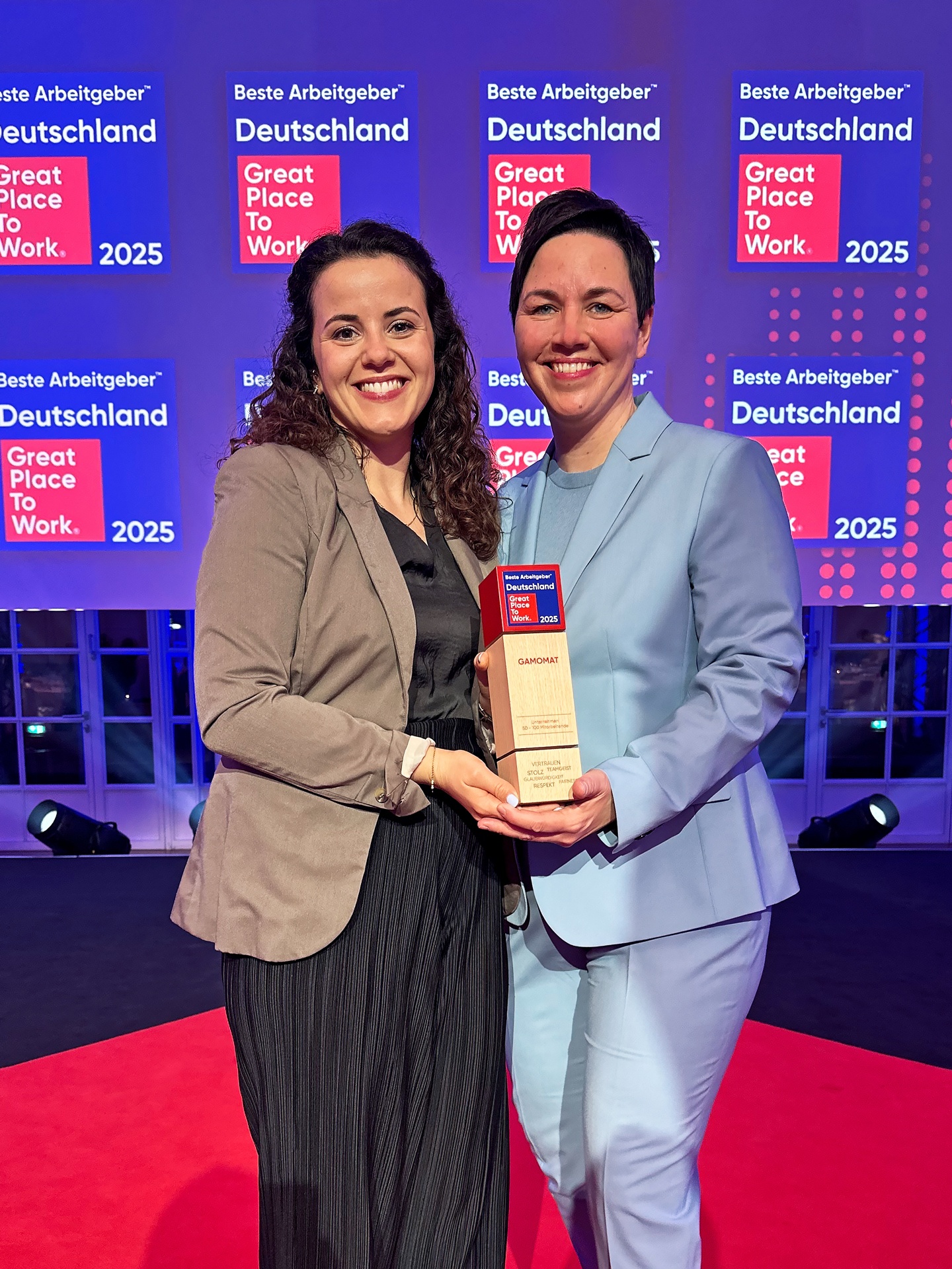 Als eines von 100 Unternehmen hat es GAMOMAT auch 2025 beim Zertifizierungssprozess des Forschungs- und Beratungsinstituts"Great Place to Work®"auf die Bestenliste geschafft."Es ist beeindruckend, wie konsequent und nachhaltig die teilnehmenden Unternehmen in der Great Place To Work®-Initiative regelmäßig das Feedback ihrer Mitarbeitenden einholen, um ihr Unternehmen weiterzuentwickeln, und das in einem zu Teilen so volatilen Marktumfeld", sagt Andreas Schubert, Geschäftsführer bei Great Place To Work® Deutschland."Dass sie es beiüber 1.000 teilnehmenden Unternehmen geschafft haben, auf die Bestenliste zu gelangen, zeigt die Spitzenqualität in Bezug auf die gelebte Unternehmenskultur."