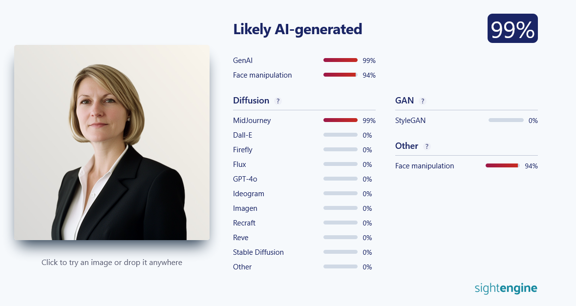 (IINews) - Da wir die abgebildeten Personen nichtüber Bildsuchmaschinen identifizieren können, liegt die Vermutung nahe, dass es sich um KI-generierte Bilder handelt. Und tatsächlich. Wir machen Tests mit verschiedenen KI-Image-Checkern. Das Ergebnis ist immer das gleiche: Es wird eine Quote von über 98 Prozent erreicht, dass es sich um KI-generierte Bilder handelt.