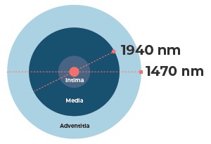 Durch individuell anpassbare Energiedosierung und Mischung der Wellenlängen für maximale Effektivität bei minimaler thermischer Belastung ermöglicht der Dual 20 die exakte Abstimmung der Behandlung auf den jeweiligen Patienten und die einzelnen anatomischen Bereiche. Die bewährte und effektive Wellenlänge 1470 nm mit hoher Absorption in Wasser eignetsich sehr gut für sicheres kontrolliertes Schrumpfen der Venenwand und ist ideal für große Stammvenen. Mit noch höherer Wasserabsorption und geringerer Eindringtiefe wirkt die präzisere und für das Gewebe schonendere Wellenlänge 1940nm vor allem in den inneren Schichten der Venenwand (Intima und Media; siehe Abbildung) für optimale Kontrolle in sensiblen Arealen. (1) Der LEONARDO® Dual 20 wurde entwickelt, um geringere postoperative Beschwerden, kürzere Erholungs- und weniger Ausfallzeiten zu ermöglichen. Die ästhetischen Ergebnisse überzeugen bei zugleich minimalen Risiken für Nebenwirkungen wie Hämatomen oder Parästhesien.