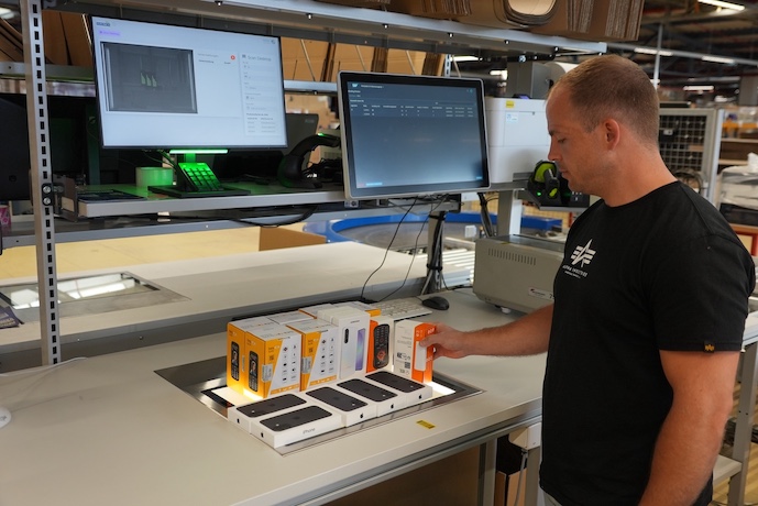 Dort werden die kommissionierten Teile sorgfältig an vierzehn Packtischen gescannt, mit den Auftragsdaten abgeglichen, verpackt und für den Versand etikettiert. Beim Scannen der Smartphones geht es nicht nur um die Modellbezeichnung der verkauften Handys, sondern vor allem um die Serien- und IMEI-Nummern. Diese kleben im Mini-Format aufden zum Teil nur 25 mm hohen Verpackungen. Besonders herausfordernd für den Scan sind Dual-SIM-Smartphones, die über zwei IMEI-Nummern verfügen, von denen jedoch nur eine erfasst werden darf.
