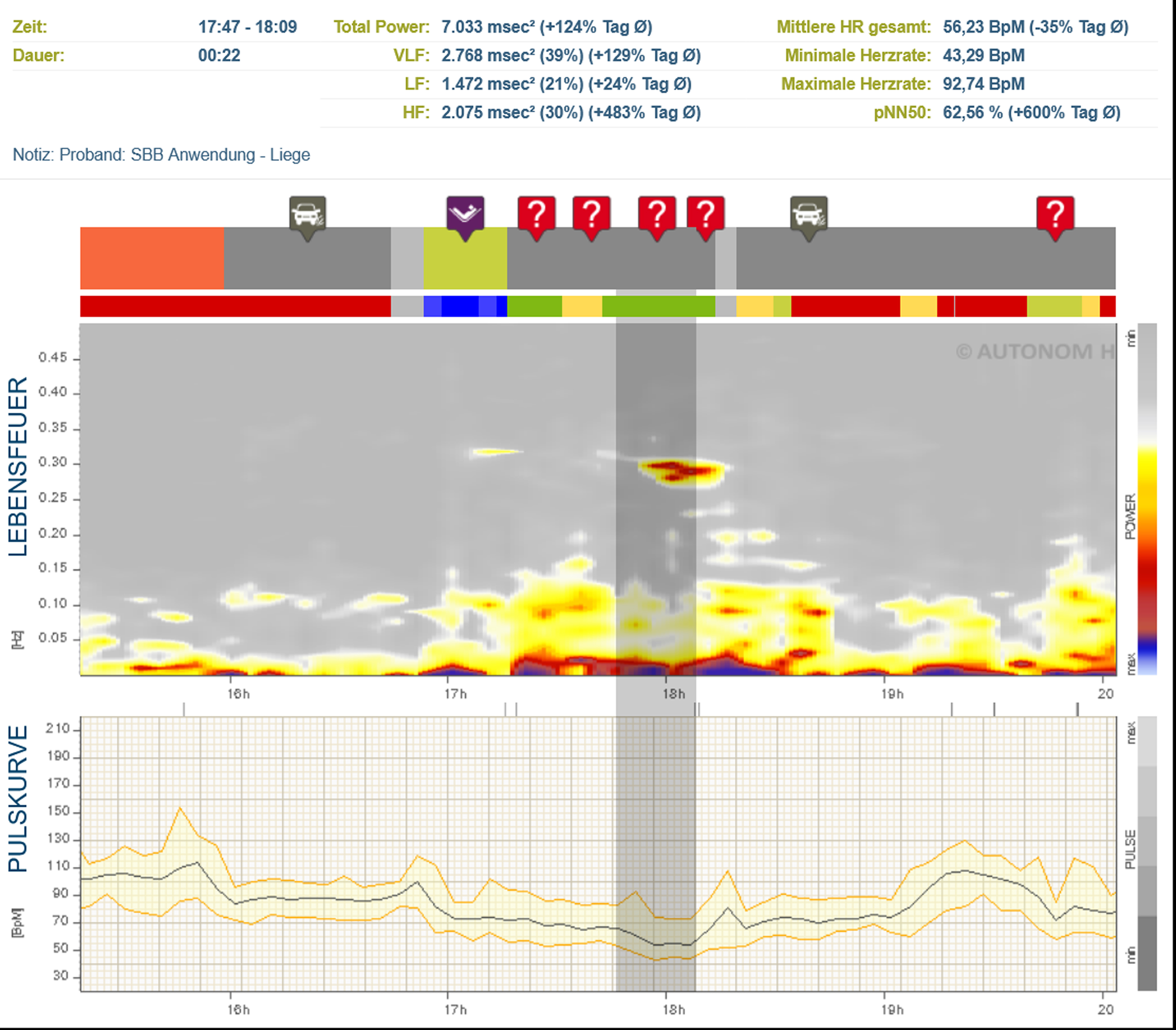 In addition to numerous remarkable testimonials, we now have measurement data that proves a positive effect of subtle body work on the autonomic nervous system: A study was conducted on the effectiveness of Subtle Body Balance by means of heart rate variability (HRV) measurements. The HRV measurement is considered an objective measure of the physical and mental state and shows what is beneficial. Long-term measurements with test subjects have revealed a strengthening of the entire autonomic nervous system. The effect of the Subtle Body Balance treatment shows a strongly pronounced, repeatable pattern in the HRV - an example is shown below. The four question marks on the graph indicate the period of the Subtle Body Balance session: Theory, Exercises, Treatment and Follow-up. The values listed were measured during the treatment on the treatment table.