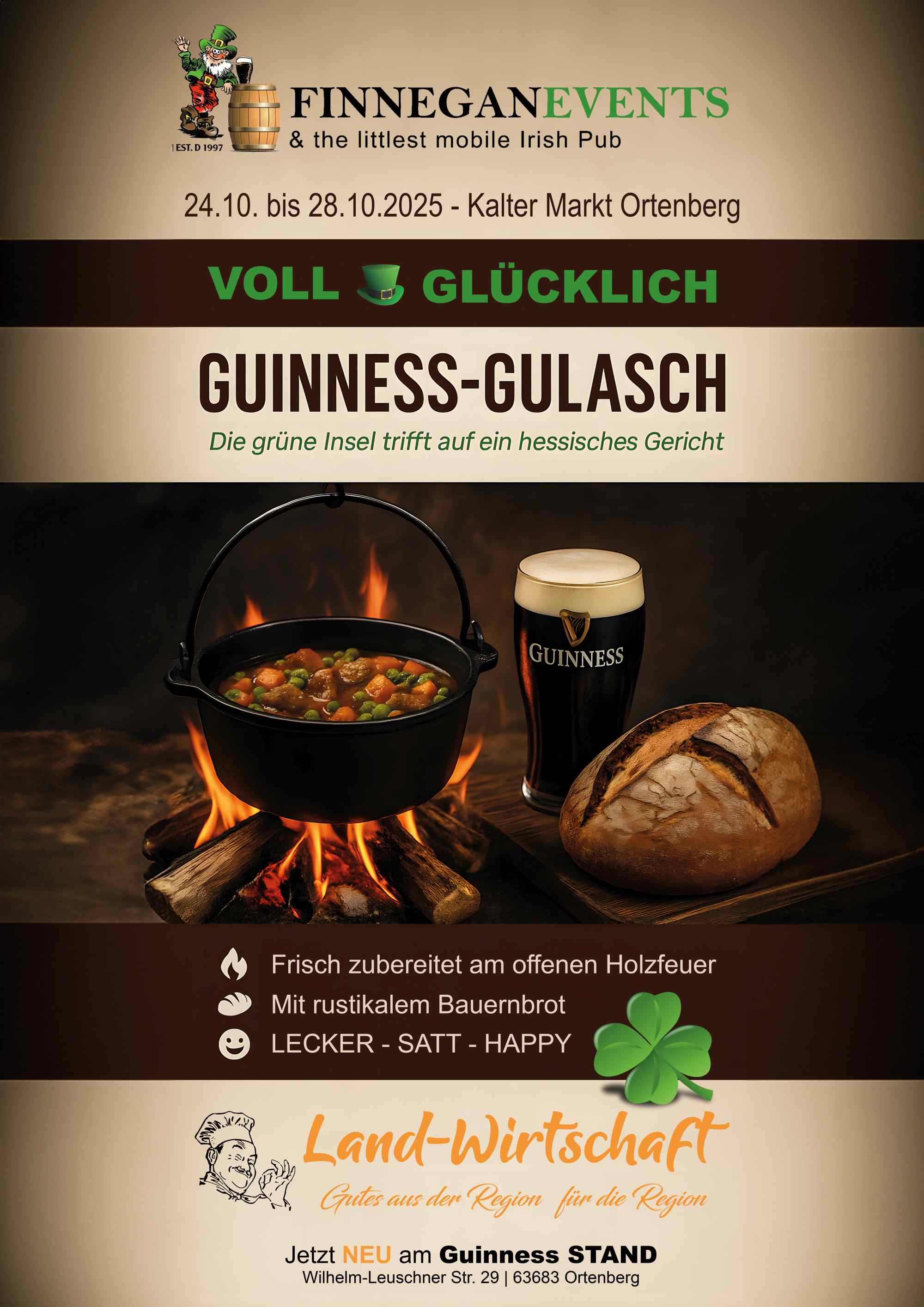 Ein Muss für jeden Besucher ist das deftige"Guinness-Gulasch", zubereitet von der Land-Wirtschaft - Wetterau. Dieses kulinarische Meisterwerk wird nach dem Prinzip"handmade"und mit größter Sorgfalt stundenlang in einem großen Kessel über einem offenen Holzfeuer frisch zubereitet - für alle sichtbar. Der dabei entstehende Duft ist ein unwiderstehliches Versprechen für echten Genuss. Serviert wird das Guinness-Gulasch zu einem adäquaten Preis mit frischem rustikalem Bauernbrot oder wahlweise Nussbrot, einem klecks Schmand und einer Brise Petersilie. Ein Geschmackserlebnis, das in Erinnerung bleibt.