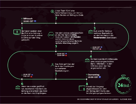 Internationale Devisenzahlungen durchlaufen zahlreiche Prozessschritte, bevor sie den Empfänger erreichen. Nach Sicherheits- und Compliance-Prüfungen werden sie über Korrespondenzbanken geleitet, sofern keine direkte Beziehung zwischen Absender- und Empfängerbank besteht. Ein anschauliches Beispiel anhand einer Zahlung von Europa nach China verdeutlicht, wie viele Prozessschritte dies tatsächlich erfordert. Das Schaubild zeigt, dass unterschiedliche Zeitzonen, die Öffnungszeiten der beteiligten Banken sowie die Weiterleitung über mehrere Korrespondenzbanken dazu führen können, dass selbst reibungslose Zahlungen bis zu 24 Stunden benötigen. Die Darstellung unterstreicht, warum strukturelle Faktoren im Bankennetzwerk einen erheblichen Einfluss auf die tatsächliche Abwicklungsdauer haben.