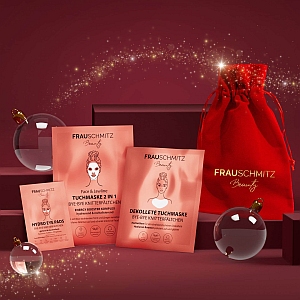Im eleganten roten Samtbeutel verpackt, enthält das exklusive Weihnachtsset drei Tuchmasken der beliebten FRAUSCHMITZ Beauty BYE-BYE-KNITTERFÄLTCHEN Tuchmasken – perfekt für festliche Verwöhnmomente: