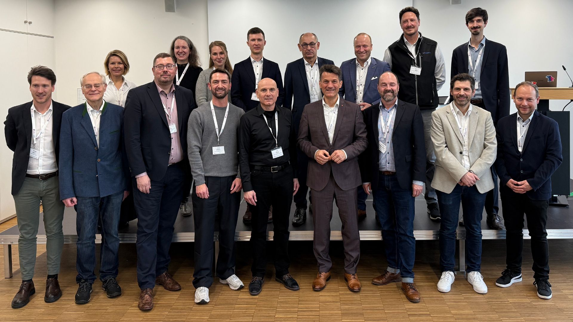 Gruppenfoto mit Organisatoren und Referenten des Strategiedialogs Automobilwirtschaft Regensburg; vordere Reihe v.li.: Philipp Berr, Joachim Scherrer, AndréKoos, Florian Heitzer, Uwe Pfeil, Prof. Dr. Georg Stephan Barfuß, Alexander Rupprecht, Florian Klimmer, Michael Hellwig, hintere Reihe v.li.: Natalie Schwab, Maria Hirschberger, Melanie Terne, Hermann Hampel, Dr. Georg Schwab, AndréKühnle, Thomas Decker, Matthias Streller (Foto: Vincent Wodowski, TechBase Regensburg GmbH)