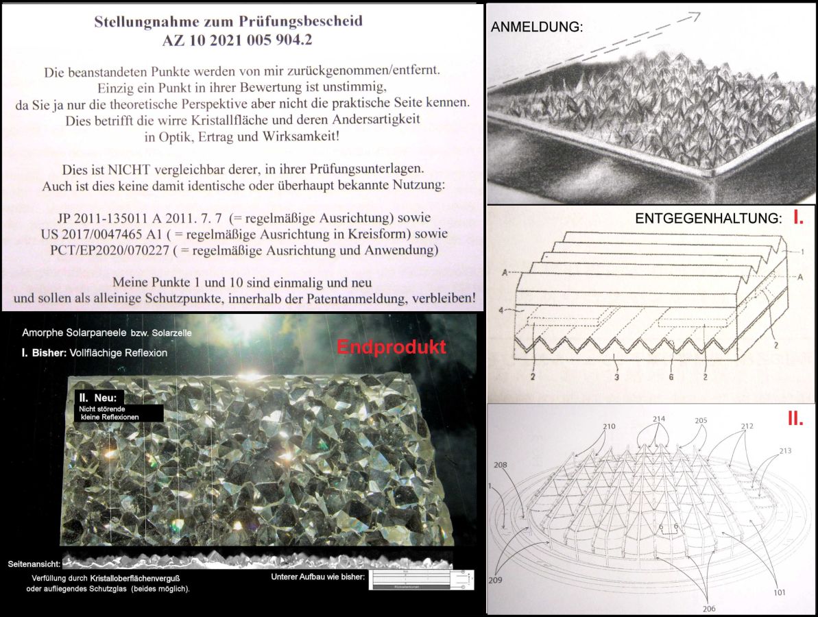 "Ihre Patentanmeldung mit dem Aktenzeichen 10 2021 005 904.2 mit der Bezeichnung‚Solarmodul bzw. Solarpaneel mit größtmöglicher Oberfläche befindet sich noch im Patentprüfungsverfahren. Das Patent wurde bisher nicht erteilt. Status: Anhängig/in Kraft."
