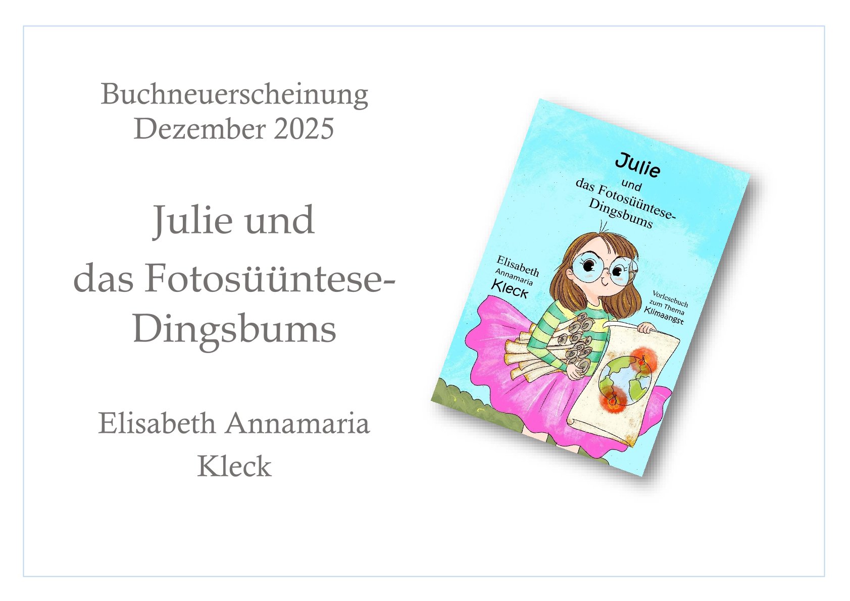 München, Dezember 2025–Ein Jahr nach ihrem erfolgreichen Erstlingswerk veröffentlicht die Münchner Autorin Elisabeth Annamaria Kleck den zweiten Teil ihrer beliebten Julie-Reihe:„Julie und das Fotosüüntese-Dingsbums“, der Ende 2025 bei tredition erscheint.